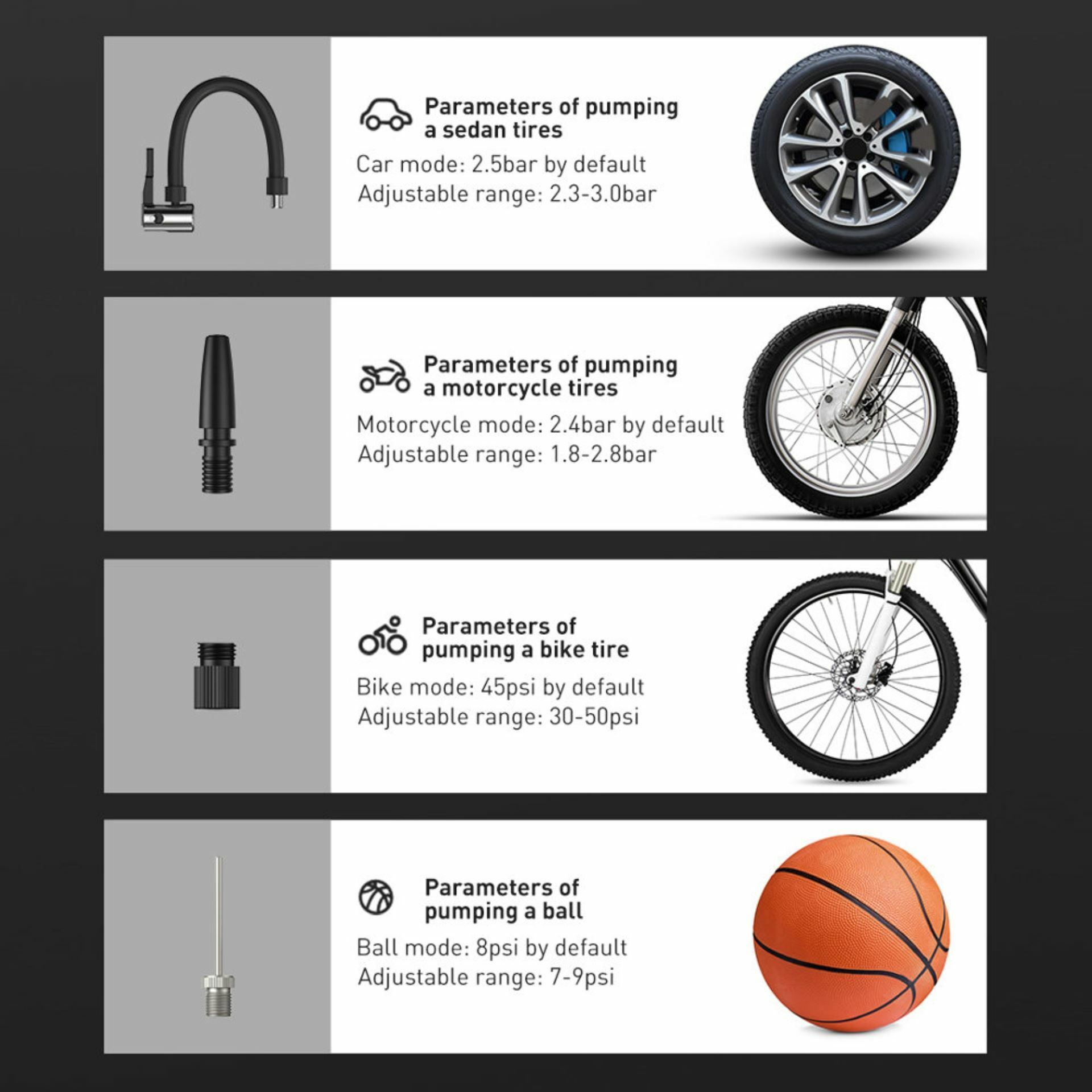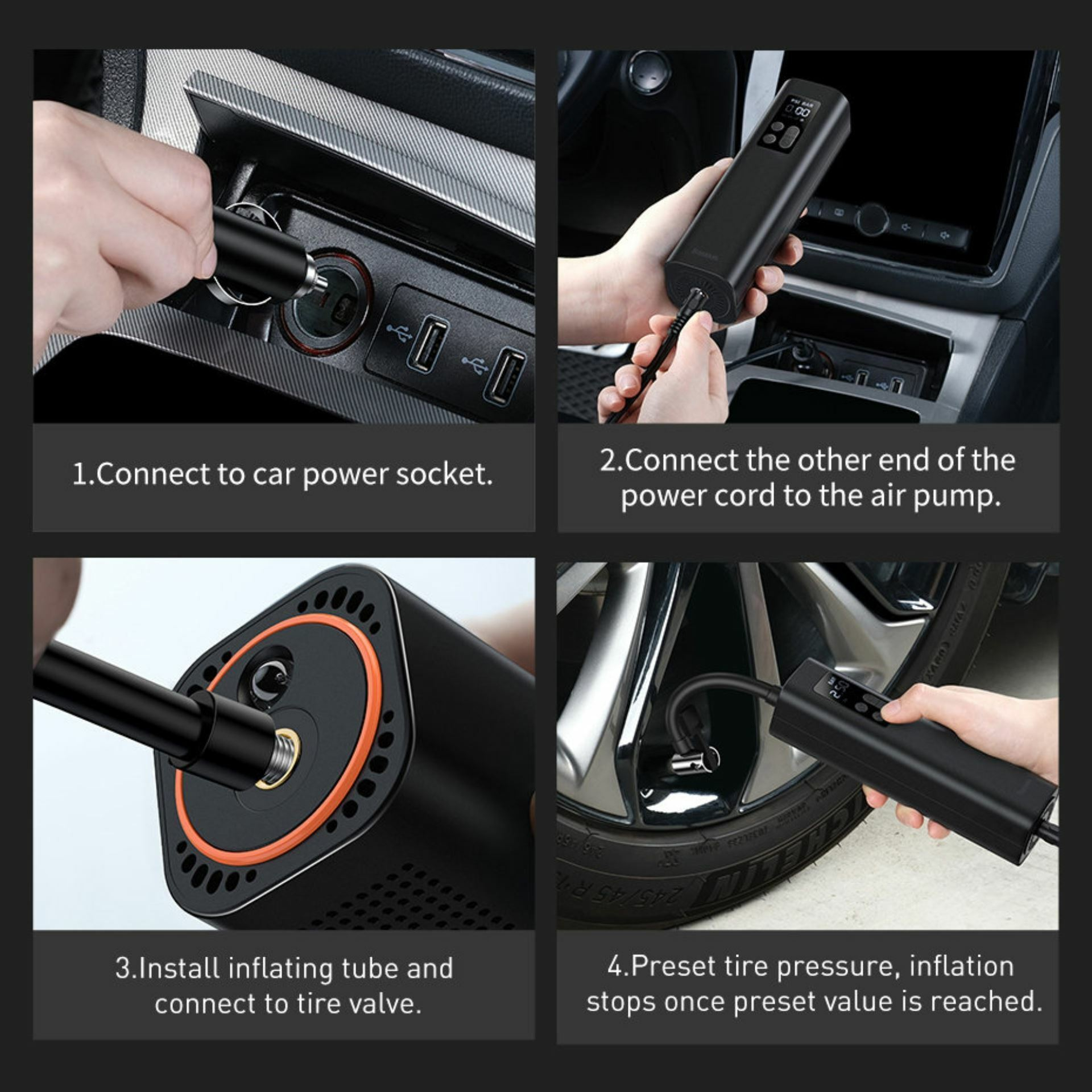 Baseus mini kompresorska črpalka za avtomobilska kolesa . Vaše pnevmatike bo preveril v samo 0,1 sekunde, za napihovanje pa bo potrebnih še dodatnih 50 sekund. Potrebna sta samo dva preprosta koraka! Za zagon črpalke potrebujete le avtomobilski vžigalnik. Črpalka samodejno nastavi in dopolni tlak v pnevmatikah brez posredovanja uporabnika.