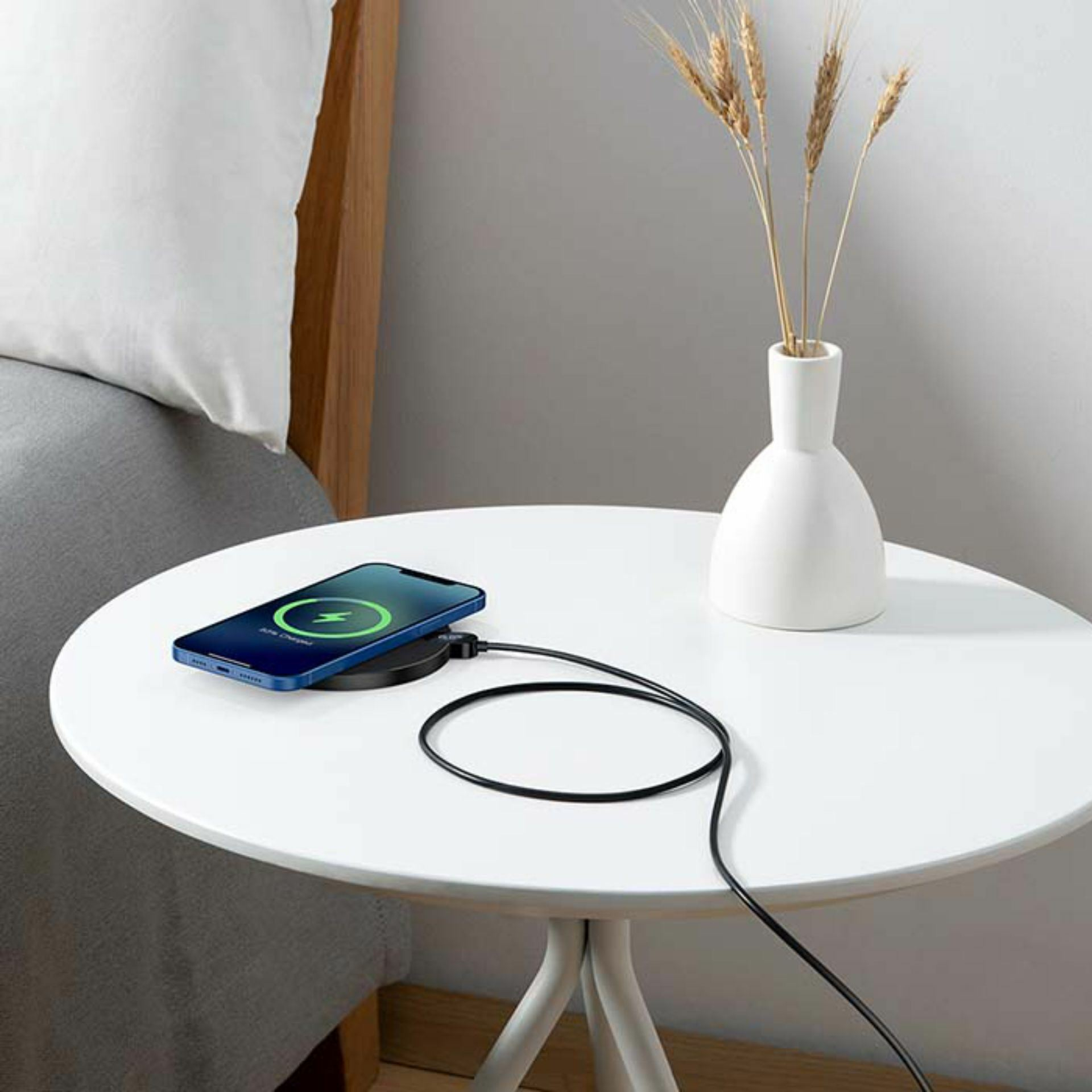 Baseus CCED000001 je kompakten brezžični polnilec, ki omogoča hitro 15W polnjenje. Je eleganten, narejen iz trpežnega aluminija in stekla privlačne črne barve. Podpira širok spekter naprav, vključno z Apple in Android telefoni, ki omogočajo brezžično polnjenje.