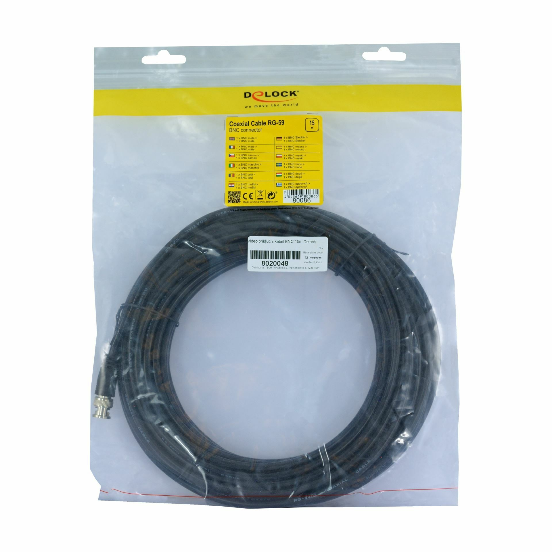 Delock BNC kabel dolžine 15m za priključitev video prenosnih sistemov (npr. analogni videonadzorni sistem).