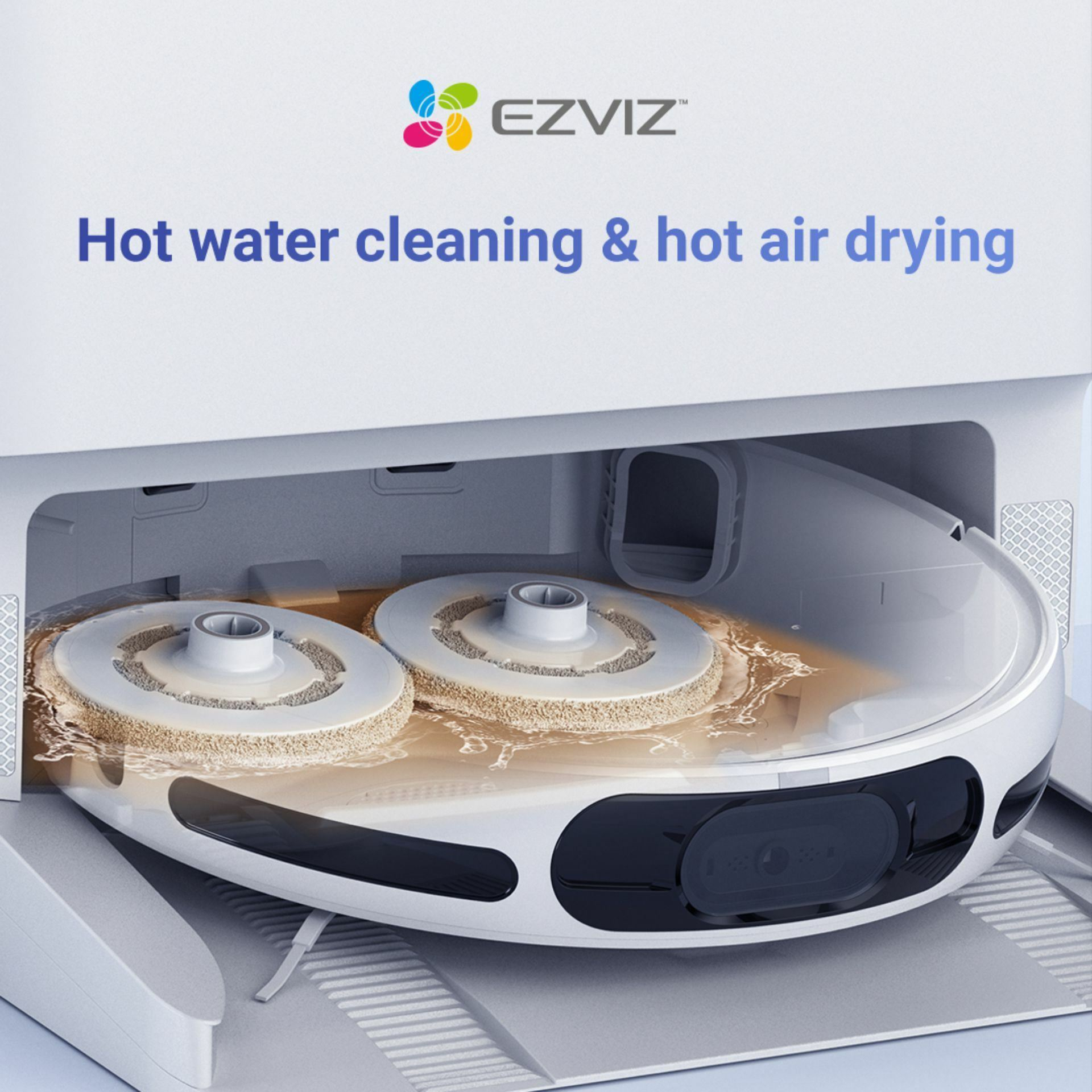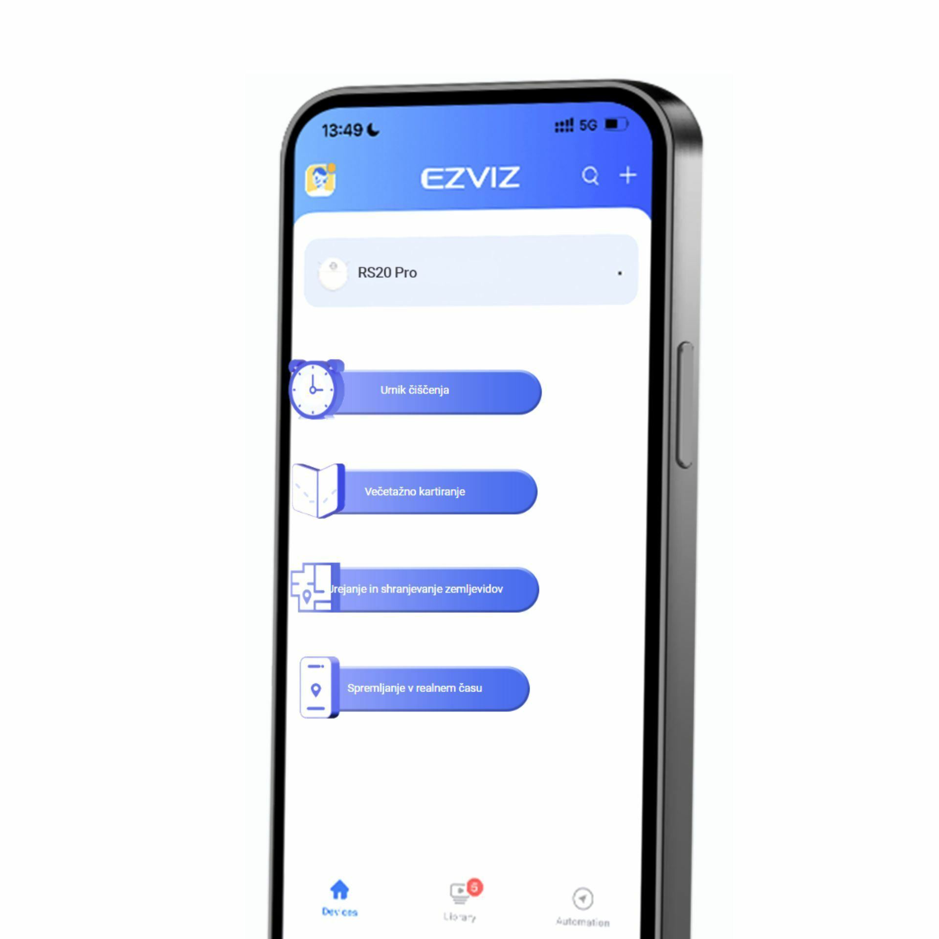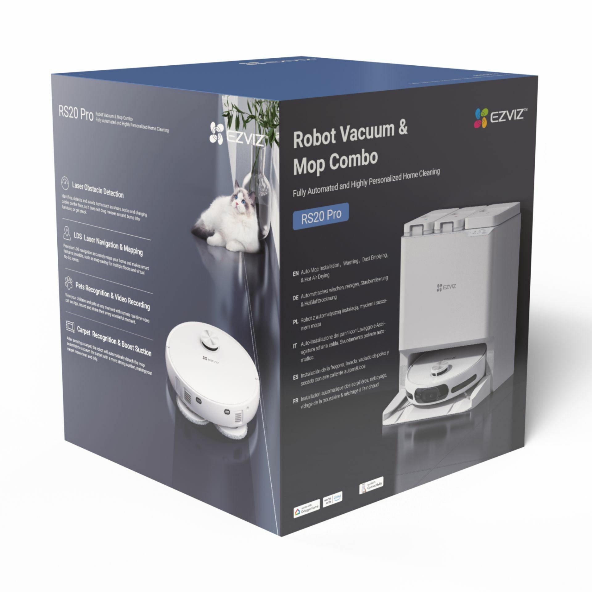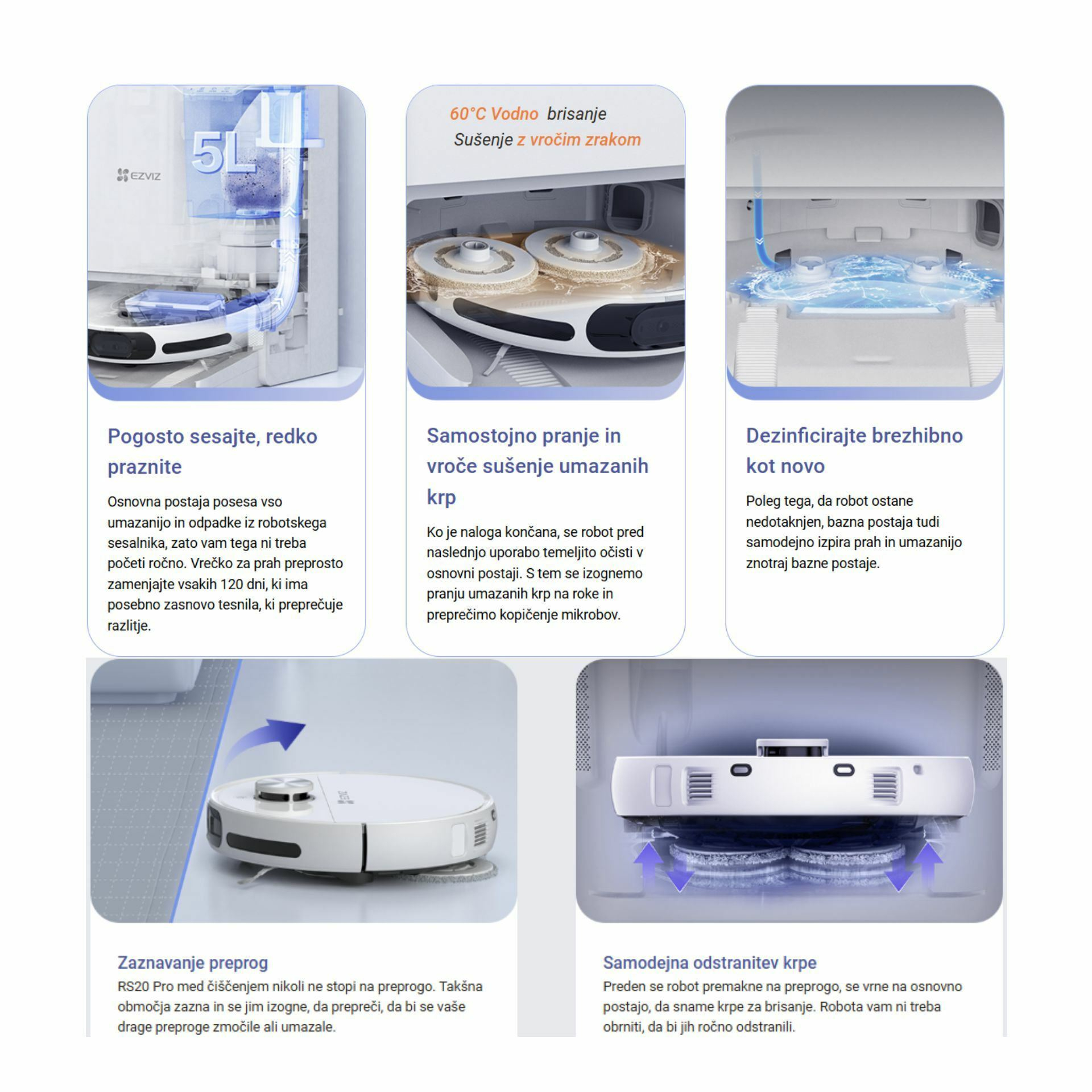 EZVIZ RS20 Pro je robotski sesalnik in čistilec z ločeno večnamensko postajo, ki omogoča samodejno nameščanje in odstranjevanje mopov, polnjenje vode, praznjenje posode za prah in pranje z vročo vodo. Sistem LiDAR, 3D lasersko zaznavanje in AI kamera omogočajo natančno navigacijo in prepoznavanje več kot 65 vrst predmetov. Z močjo sesanja 7200 Pa, 3-v-1 krtačo in dvojnim vrtečim mopom dosega učinkovito čiščenje trdih tal in preprog, pri katerih samodejno dvigne ščetke ter poveča sesalno moč.