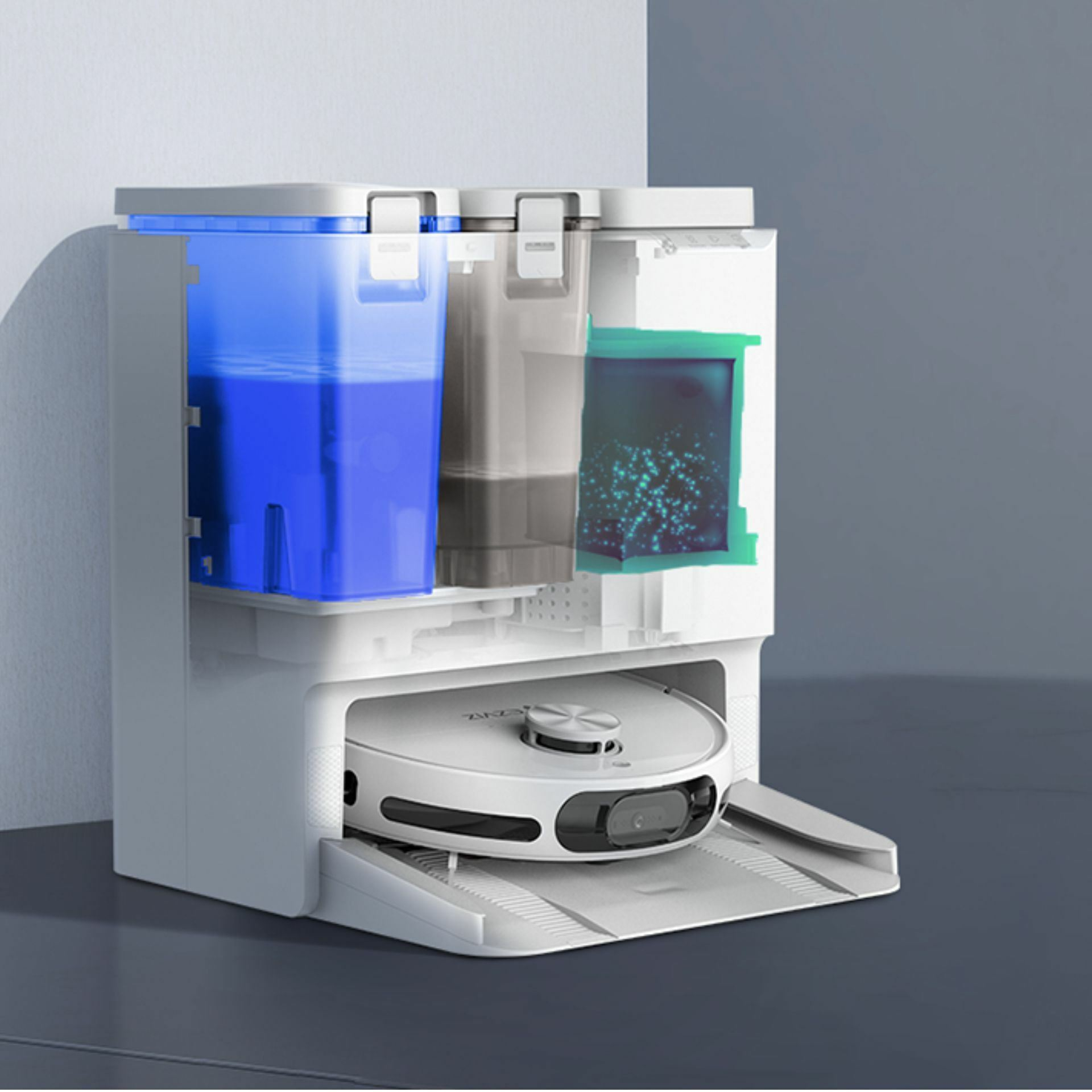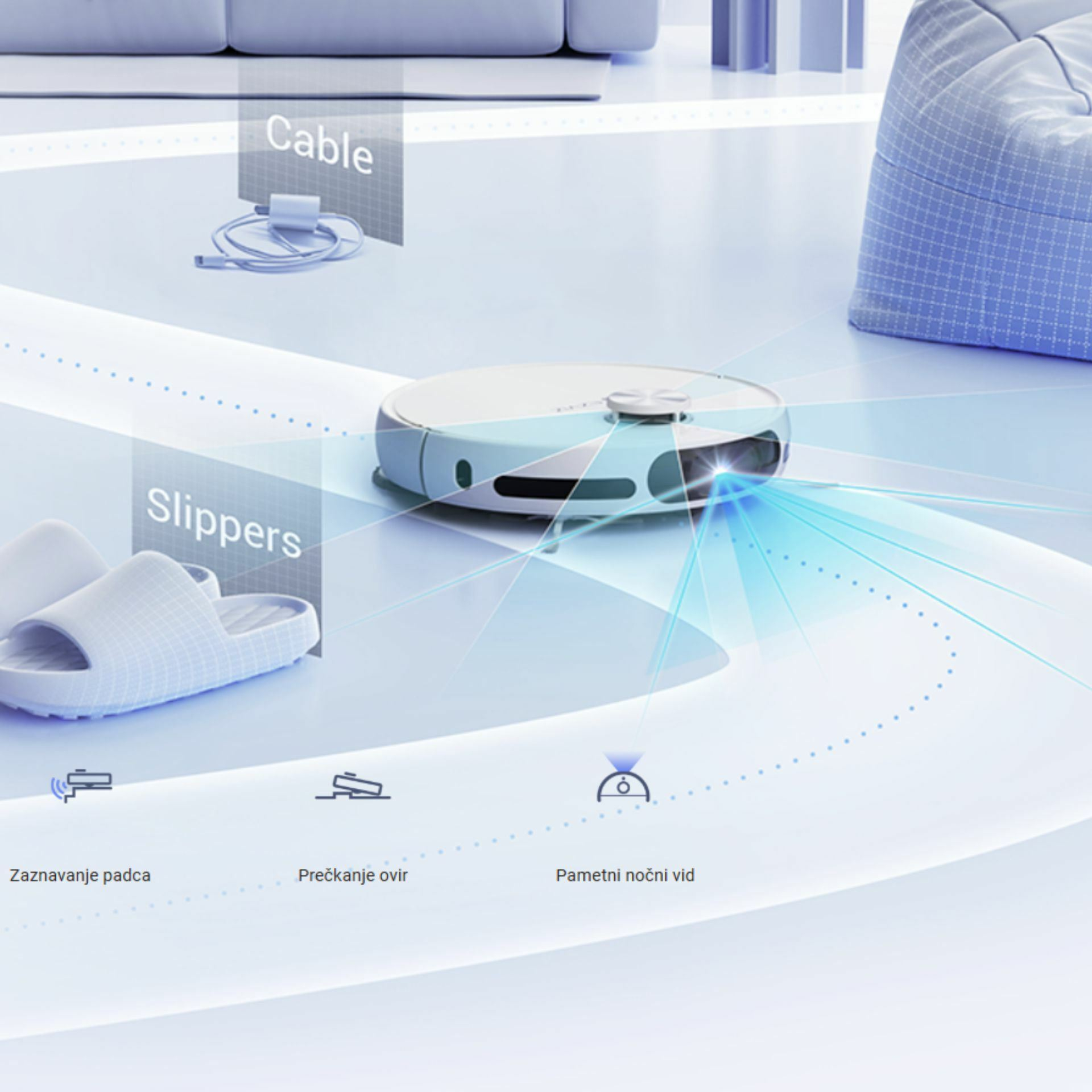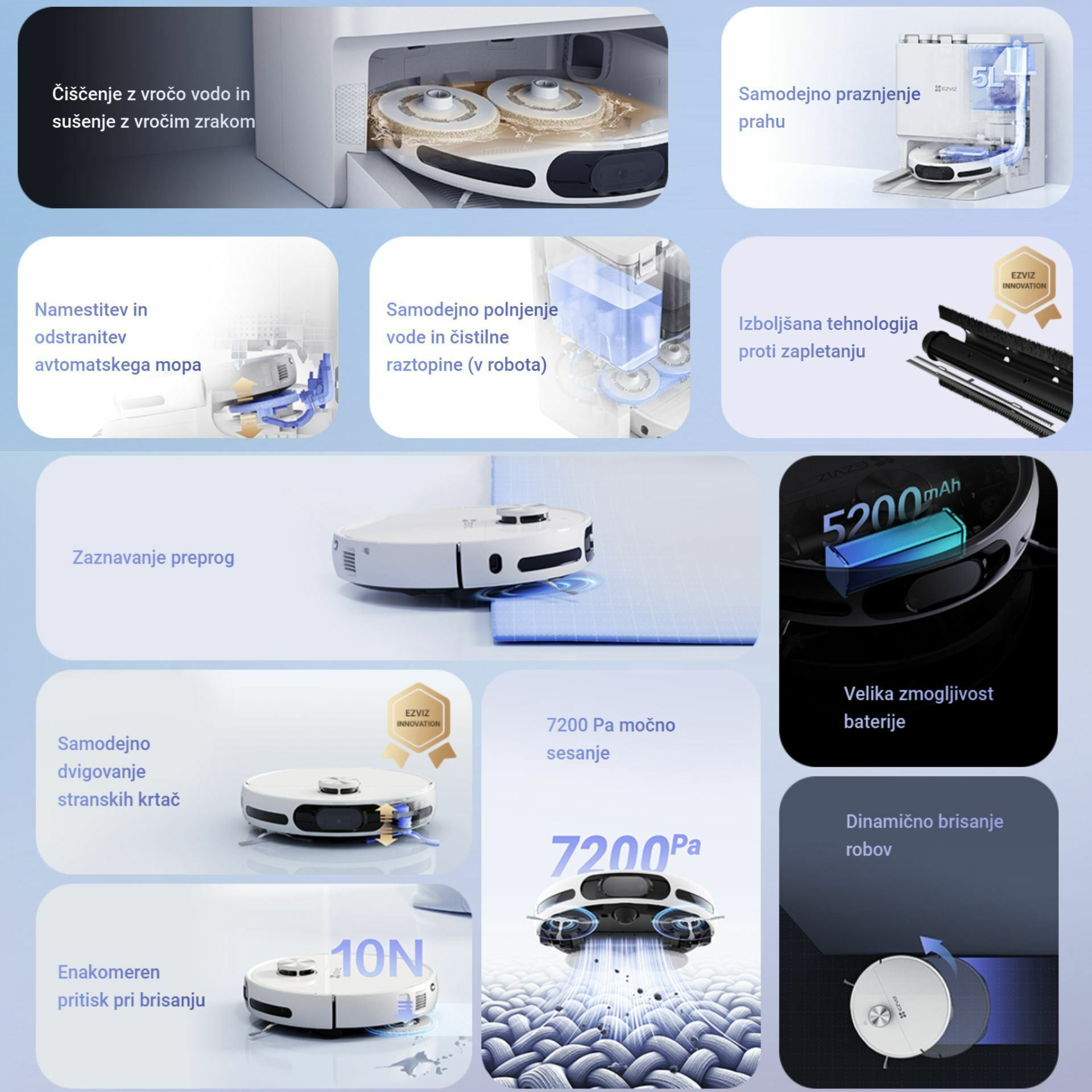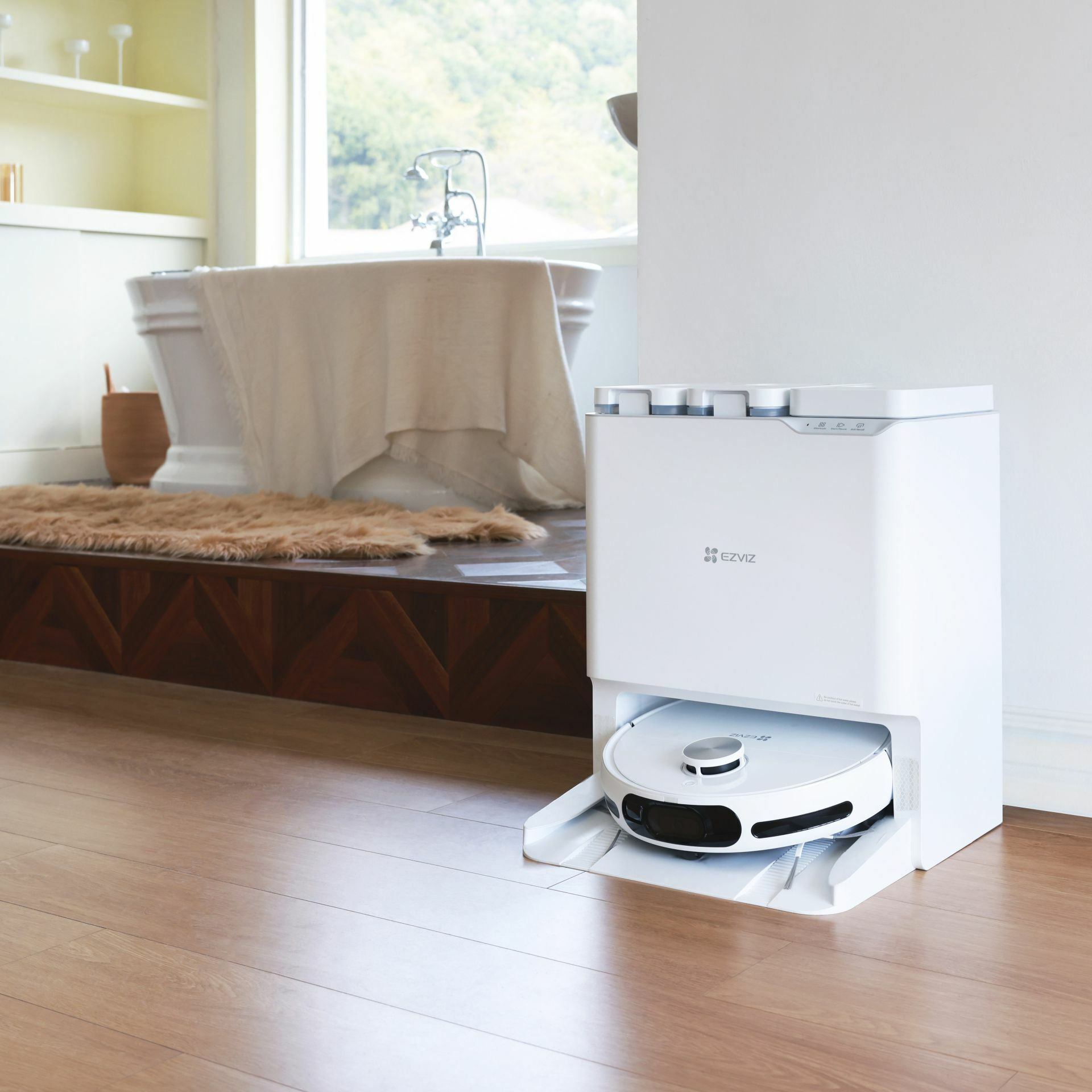 EZVIZ RS20 Pro je robotski sesalnik in čistilec z ločeno večnamensko postajo, ki omogoča samodejno nameščanje in odstranjevanje mopov, polnjenje vode, praznjenje posode za prah in pranje z vročo vodo. Sistem LiDAR, 3D lasersko zaznavanje in AI kamera omogočajo natančno navigacijo in prepoznavanje več kot 65 vrst predmetov. Z močjo sesanja 7200 Pa, 3-v-1 krtačo in dvojnim vrtečim mopom dosega učinkovito čiščenje trdih tal in preprog, pri katerih samodejno dvigne ščetke ter poveča sesalno moč.