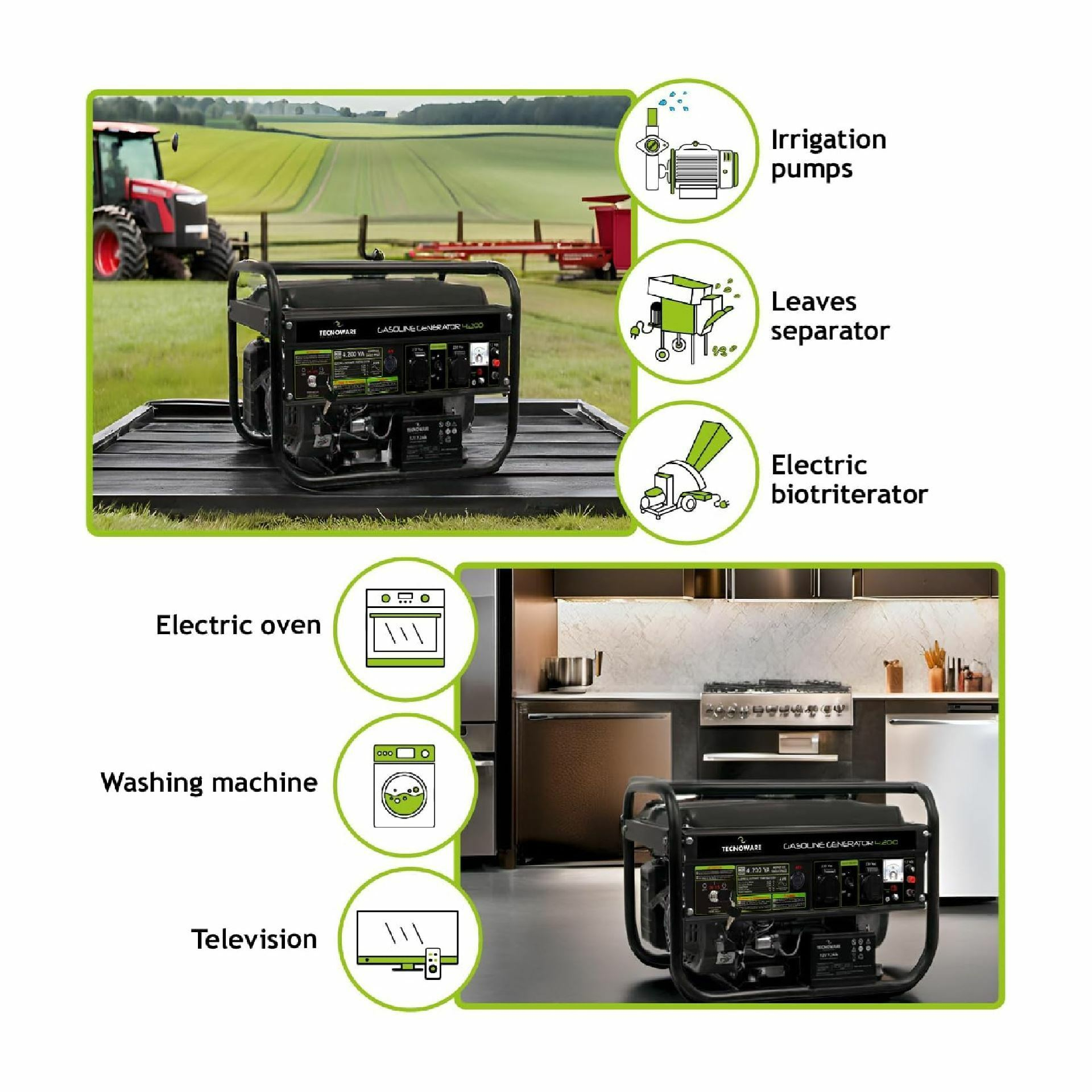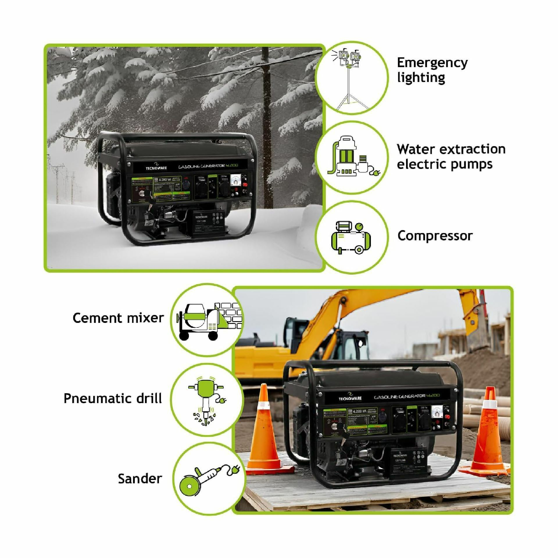 Tecnoware bencinski agregat FGE4200EA je namenjen napajanju električnih naprav v okoljih brez stalnega vira energije. Opremljen je z enofaznim izhodom 230 V ter AVR regulatorjem napetosti, ki zagotavlja stabilno delovanje priključenih naprav.